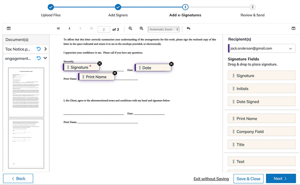 eSign engagement letters, questionnaires, AI-generated document request lists.